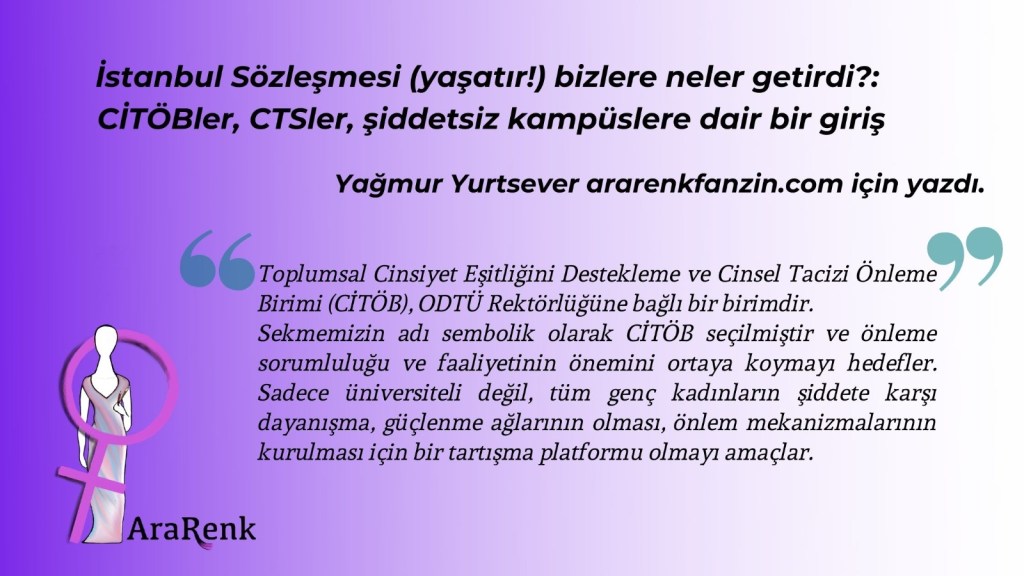 Türkiye, Kadınlara Yönelik Şiddet ve Aile İçi Şiddetin Önlenmesi ve Bunlarla Mücadeleye İlişkin Avrupa Konseyi Sözleşmesi’ne, ya da daha çok bilinen adıyla İstanbul Sözleşmesi’ne (yaşatır!) imzacı olarak hane içi dâhil olmak üzere, kadına yönelik her türlü şiddetin toplumsal sorun olduğunu kabul etmiş ve kamunun şiddeti önleme ve toplumsal cinsiyet eşitliğini sağlama sorumluluğu olduğunu kabul etmiştir. İstanbul Sözleşmesi’ne imzacı olunmasıyla, pek çok kamu kuruluşu toplumsal cinsiyet eşitliği için sorumluk almış, sözleşme koşullarını yerine getirme yöntemlerini ortaya koymuş ve yayınlar yapmıştır. Bunlardan biri ise Yükseköğretim Kurulu (YÖK) Toplumsal Cinsiyet Eşitliği Tutum Belgesi’dir. Bu belgenin ortaya koyduğu yöntemlerden biri ‘inceleme ve şikâyet mekanizmalarının kurulması’, yani CİTÖB veya CTS’lerin kurulmasıdır. Aynı zamanda, bu mekanizmaların kurulmasıyla, kadına yönelik şiddet ve cinsel taciz disiplin suçu haline gelir.
