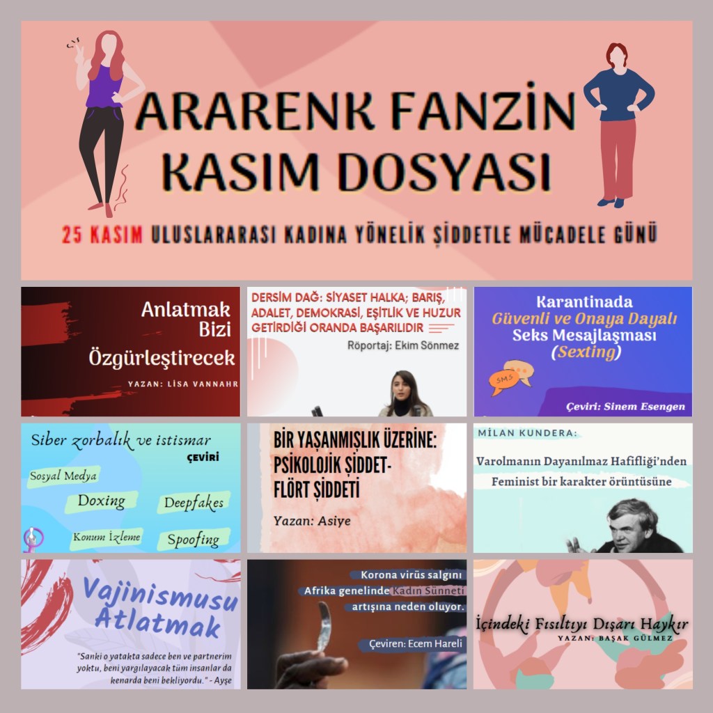 Bizler, AraRenk fanzin olarak, feminist bir gaye ve duruşla çıktığımız bu yolda 25 Kasım’a yönelik bir yazı kampanyası başlatmıştık. Katledilen kadınları, şiddete uğrayan, erkek devlet şiddetini her gün yaşayan bizleri, kadınları, genç kadınları, üniversiteli kadınları, trans kadınları, bütün kadınları selamlamak, onları anmak, kadın dayanışmamızı katmerlendirmek, kadına yönelik şiddeti görünür kılmak, yaşadıklarımızı anlatmak ve buna karşı sesimizi yükseltmek üzere biz de Kasım ayında 25 Kasım’a yönelik yazılar yazdık ve bize gelen yazıları yayınladık.