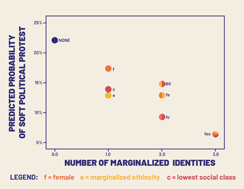 Yukarıdaki grafik biriken marjinalleştirmenin etkilerini gösteriyor. Kesişim oranı (kişinin sahip olduğu marjinalleştirilmiş kimliklerin sayısı) arttıkça siyasi katılımı düşüyor.